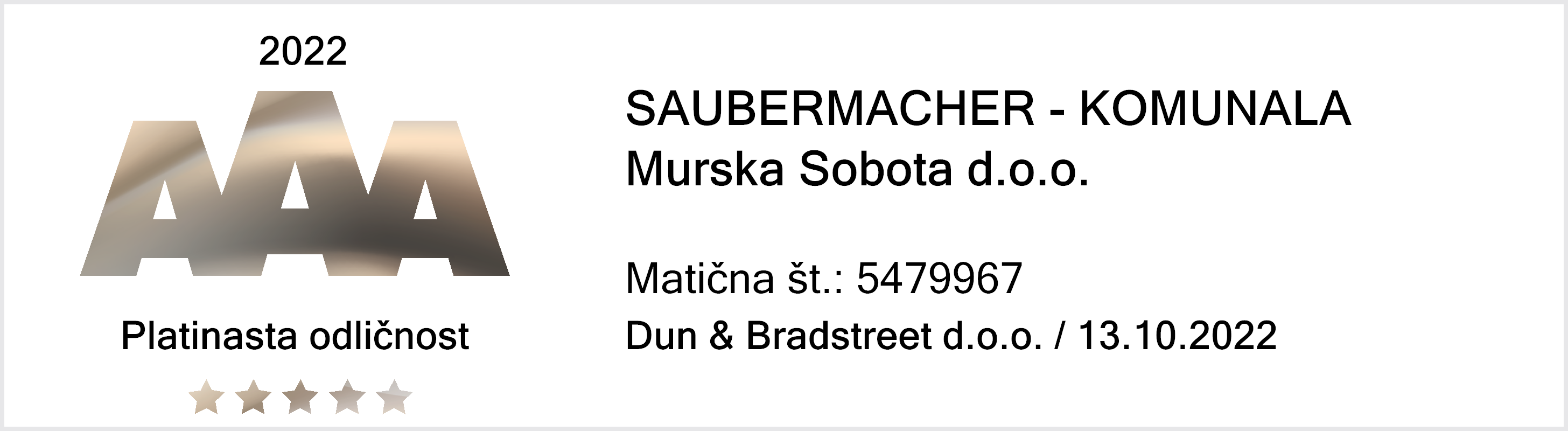 Družba Dun & Bradstreet, ki v okviru mednarodnega projekta izvaja finančne analize podjetij in ima večletno tradicijo v podeljevanju certifikatov bonitetne odličnosti v 12-ih evropskih državah, tudi v Sloveniji, je podjetju Saubermacher – Komunala Murska Sobota d.o.o. tudi letos podelila certifikat platinaste bonitetne odličnosti. V Sloveniji je v letu 2022 med vsemi 234.740 registriranimi podjetji, platinasto bonitetno odličnost doseglo le 3,6% podjetij.
