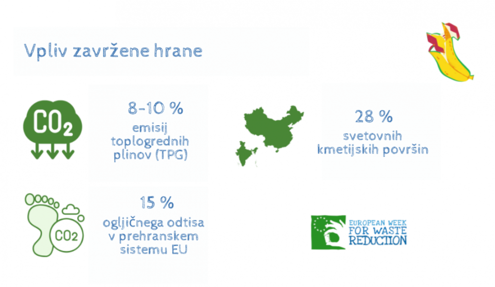 Odpadna hrana po nepotrebnem obremenjuje omejene naravne vire in okolje ter vpliva na gospodarsko, družbeno in okoljsko trajnost prehranskih sistemov. Pomeni izgubo virov, ki se uporabljajo v proizvodnji (voda, energija…) ter povečanje emisij toplogrednih plinov. Po podatkih Združenih narodov izgube hrane in odpadna hrana povzročijo kar osem do deset odstotkov vseh emisij toplogrednih plinov, ti pa povzročajo podnebne spremembe, ki jih občutimo kot nestabilno vreme in ekstremne vremenske pojave.