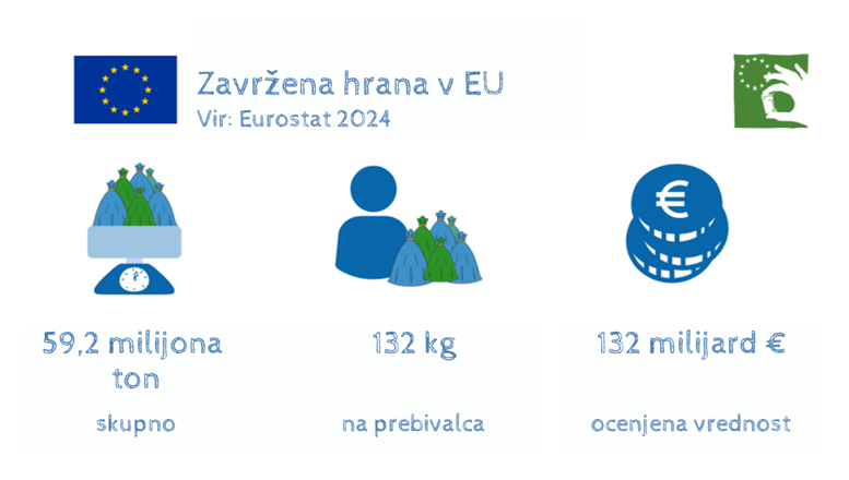 V letu 2022 je bilo v Evropski uniji zavrženo več kot 59,2 milijona ton hrane, kar v povprečju znaša 132 kg na prebivalca. Približno 54 % te količine nastane v gospodinjstvih, kar znaša 72 kg na prebivalca, preostanek pa se izgubi in zavrže v oskrbovalni verigi, vključno s kmetijami (primarna proizvodnja: 10 kg), proizvodnjo (25 kg), restavracijami in gostinskimi storitvami (15 kg), trgovino na drobno in drugo distribucijo (11 kg). Razlike med državami EU so velike, med najuspešnejšimi državami v letu 2022 sta poleg Slovenije bili Hrvaška in Madžarska, države z najvišjo stopnjo zavržene hrane na prebivalca pa so bile Portugalska, Danska in Ciper.