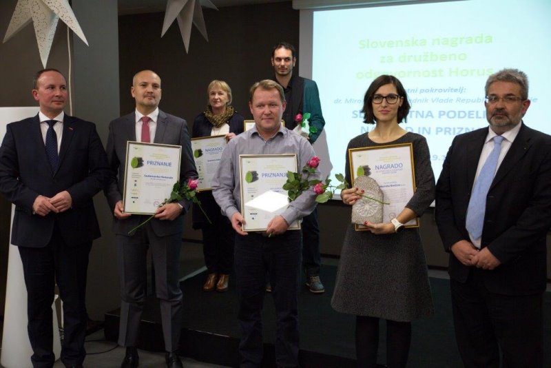 Včeraj, 19.12.2017 so bila v Hotelu City v Mariboru podeljena letošnja priznanja in nagrade v okviru razpisa za Slovensko nagrado za družbeno odgovornost Horus 2017. Nagrade in priznanja podeljujeta IRDO – Inštitut za razvoj družbene odgovornosti in PRSS – Slovensko društvo za odnose z javnostmi, v sodelovanju s številnimi podpornimi partnerji projekta. S tem projektom želijo partnerji poiskati in nagraditi celovite pristope podjetij in posameznikov k družbeni odgovornosti in trajnostnem razvoju. Častni pokrovitelj nagrade je dr. Miro Cerar, predsednik Vlade Republike Slovenije. Tudi letos je na razpisu že peto leto zapovrstjo sodelovalo naše podjetje. Tokrat nam je zmaga v kategoriji majhnih podjetij za las ušla, smo pa veseli, da je nagrado romala v roke podjetja iz naše panoge, to je podjetja Komunala Brežice d.o.o.