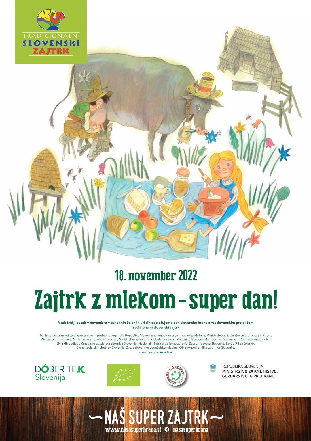 Vsako leto na Dan slovenske hrane, to je tretji petek v mesecu novembru, poteka Tradicionalni slovenski zajtrk. Tako kot vsako leto od leta 2016, smo tudi letos, tokrat sedmič zapovrstjo, v našem podjetju poskrbeli za tak zajtrk za vse zaposlene, ki so ta dan v službi. Le-ta je del aktivnosti promocije zdravja na delovnem mestu. Osrednja tema letošnjega Tradicionalnega slovenskega zajtrka je mleko in mlečni izdelki, zato je tak tudi letošnji slogan: »Zajtrk z mlekom – super dan!«